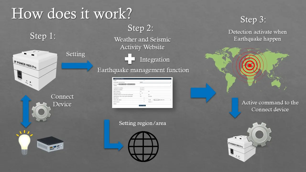 IP Power 9855 series is now equipped with a basic built-in earthquake management function and integrates with earthquake alert APIs from meteorological websites.